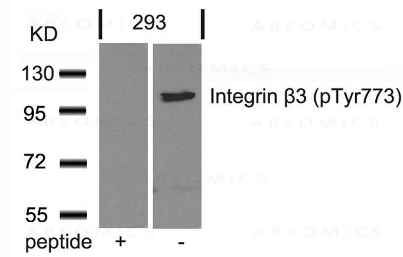 Figure 1: Western blot analysis of extracts from 293 cells using Integrin b3(Phospho-Tyr773) Antibody 35-1059 and the same antibody preincubated with blocking peptide.