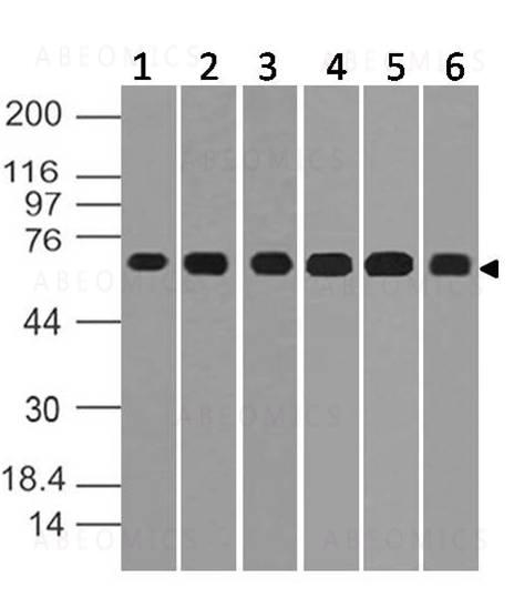 Figure-1: Western blot analysis of IRAK2. Anti-IRAK2 antibody (11-3046) was used at 0.5 µg/ml on (1) h Liver, (2) m Liver, (3) r Liver, (4) h SKM, (5) m SKM and (6) r SKM lysates..