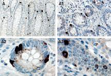 Fig:1 Immunohistochemical analysis of TANK/I-TRAF1 expression in formalin-fixed, paraffin-embedded normal human colon using 20-1068 at 1:2000. A-A3, low and high magnification images. Hematoxylin-eosin counterstain.