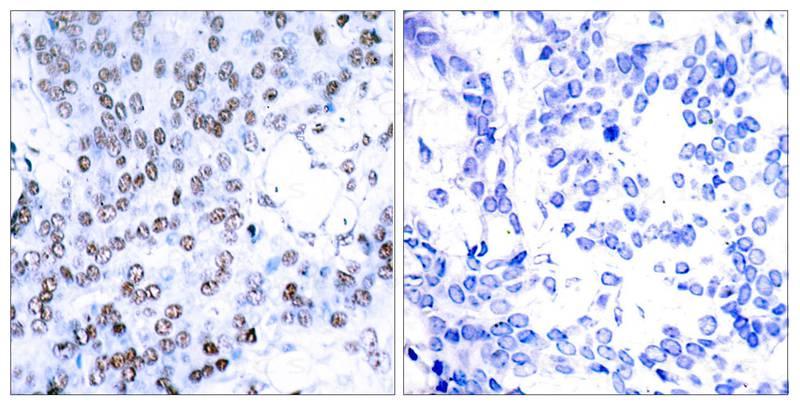 Figure 1: Immunohistochemical analysis of paraffin-embedded human breast carcinoma tissue using JunB(Ab-79) Antibody 35-1383 (left) or the same antibody preincubated with blocking peptide(right).