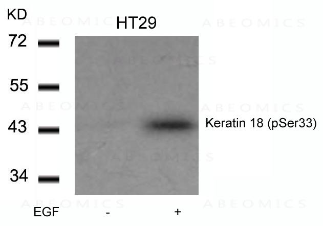 Figure 1: Western blot analysis of extracts from HT29 cells untreated or treated with EGF using Keratin 18(Phospho-Ser33) Antibody 35-1276 .
