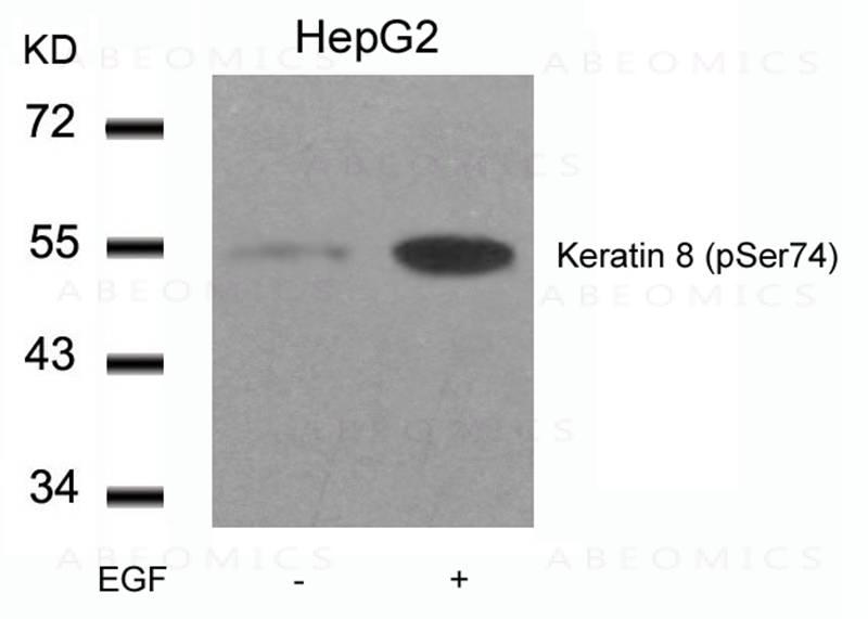 Figure 1: Western blot analysis of extracts from HepG2 cells untreated or treated with EGF using Keratin 8(Phospho-Ser74) Antibody 35-1277 .