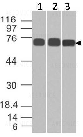 Figure-1: Western blot analysis of Lamin A/C. Anti-Lamin A/C antibody (11-8117) was used at 1 µg/ml on (1) h Testis, (2) h Ovary and (3) r Ovary lysates.