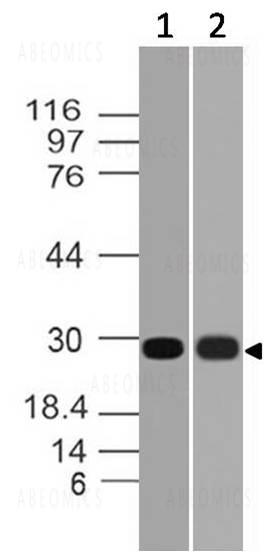 Figure-1: Western blot analysis of Latexin. Anti-Latexin antibody (11-8115) was used at 2 µg/ml on (1) PANC-1 and (2) 3T3 lysates.