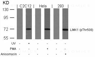 Figure 1: Western blot analysis of extracts from UV-treated C2C12, PMA-treated Hela and anisomycin-treated 293 cells using LIMK1(Phospho-Thr508) Antibody 35-1122 .