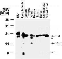 The Bcl-2 family of apoptosis-related genes plays central roles in regulating apoptotic pathways (reviewed in Thomadaki and Scorilas, 2006). Regulation of cell death through apoptosis is critical for the maintenance of homeostasis, defense against infectious agents, and normal development. Bcl-2 family proteins regulate apoptosis primarily through the regulation of mitochondrial outer membrane permeability. In mammals, the family consists of both prosurvival (antiapoptotic) and proapoptotic (prodeath) members. Cellular homeostasis is thought to be dependent on a balance between the actions of prosurvival and proapoptotic proteins. Bcl-2 family proteins can be divided into 3 main subfamilies on the basis of their function and the content of their Bcl-2 homology (BH) domains, for example: 1) Prosurvival: Bcl-2, Bcl-XL, Bcl-W, A1, and Mcl-1 2) Proapoptotic (multidomain): Bax, Bak, and Bok. 3) BH3-only (proapoptotic): Bad, Bcl-XS, Bid, Bik, Bim, Blk, Bmf, Bnip, Noxa, and Puma. Prosurvival members inhibit cells from undergoing apoptosis, whereas proapoptotic and BH3-only subfamily members promote apoptosis. There are 4 BH domains (1-4) conserved among Bcl-2 family proteins. The BH domains are important for function as well as for heterodimerization between family members. Typical prosurvival family members have all four BH domains (1-4), whereas proapoptotic (multidomain) members have BH1, 2 and 3 domains and BH3-only members have only the BH3 domain. Overall, the relative ratio of prosurvival and proapoptotic proteins determines the suseptibility of a cell to various apoptotic stimuli. Many Bcl-2 family proteins are differentially expressed in various malignancies and some are useful prognostic biomarkers. Prosurvival proteins are often elevated in diverse cancers and have the potential to confer resistance to both endogenous cell death stimuli and cancer treatments. Alterations in the ratio or levels of Bcl-2 family proteins have been also associated with nonmalignant diseases including neurodegenerative diseases, autoimmune diseases, AIDs, Down's syndrome, cardiovascular diseases, diabetes, glomerulonephritis, and muscular dystrophy. This antibody recognizes Bid (approx. 19-23 kDa) or cleaved/truncated forms of Bid. The C-terminal cleaved/truncated form (11-15 kDa) of Bid is often referred to as tBid in the literature (reviewed in Yin, 2006).