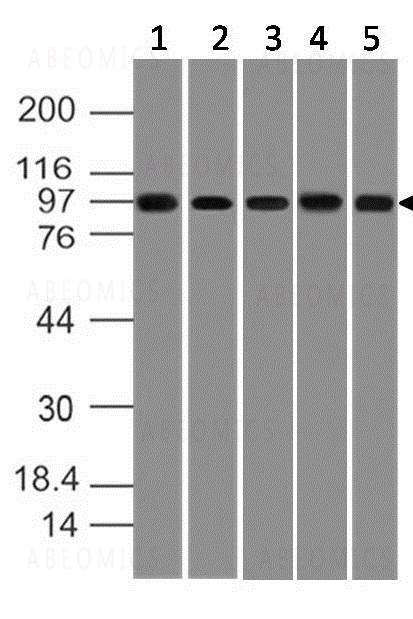 Figure-1: Western blot analysis of mTLR9. Anti- mTLR9 antibody (11-3036) was used at 2 µg/ml on (1) m Thymus, (2) m Spleen, (3) m Testis, (4) m Liver and (5) m Stomach lysates.