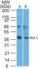 Fig:1 Western blot analysis of Mcl-1 in A) Ramos and B) ThP-1 lysate using Mcl-1 antibody at 1:2000.
