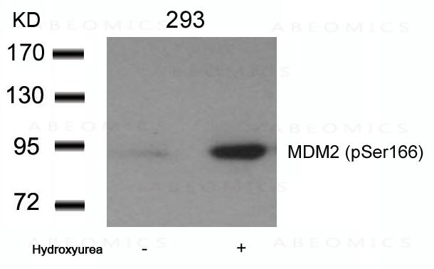 Figure 1: Western blot analysis of extracts from 293 cells untreated or treated with Hydroxyurea using MDM2(phospho-Ser166) Antibody 35-1330 .