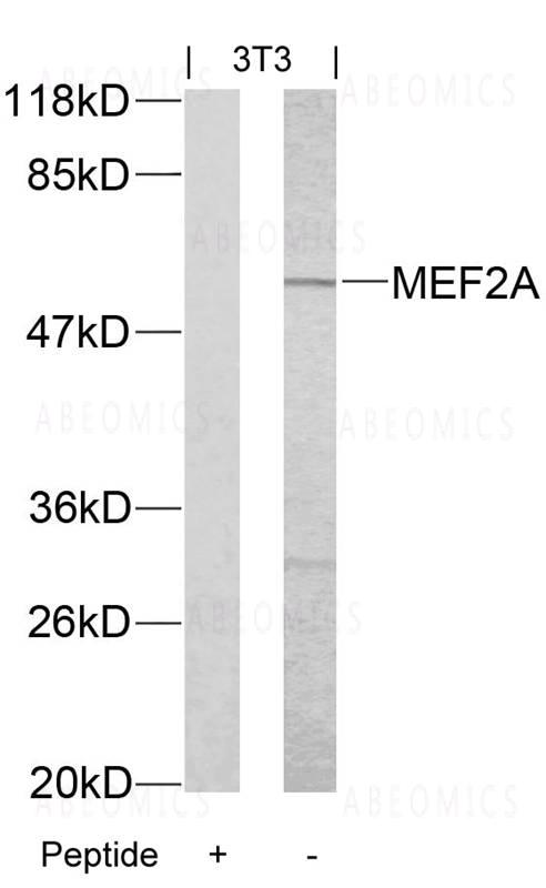 Figure 1: Western blot analysis of extracts from 3T3 cells using MEF2A(Ab-312) Antibody 35-1395 and the same antibody preincubated with blocking peptide.