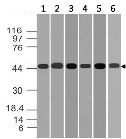 Fig-1: Western blot analysis of MEK2 . Anti- MEK2 antibody (11-8101) was used at 2 µg/ml on (1) A549, (2) A431, (3) Hela, (4) HepG2, (5) MOLT-4 and (6) Jurkat lysates.