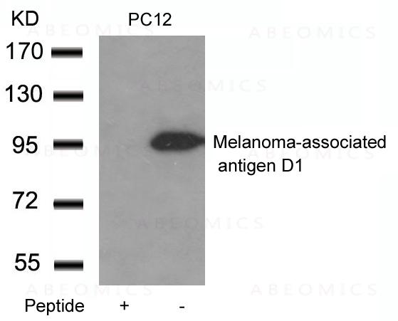 Figure 1: Western blot analysis of extracts from PC12 cells using Melanoma-associated antigen D1 Antibody 35-1662 and the same antibody preincubated with blocking peptide.