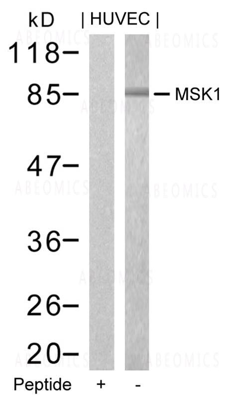 Figure 1: Western blot analysis of extracts from HUVEC cells using MSK1(Ab-376) Antibody 35-1536 and the same antibody preincubated with blocking peptide.