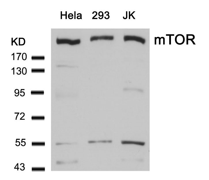 Figure 1: Western blot analysis of extracts from Hela, 293 and JK cells using mTOR(Ab-2448) Antibody 35-1552 .