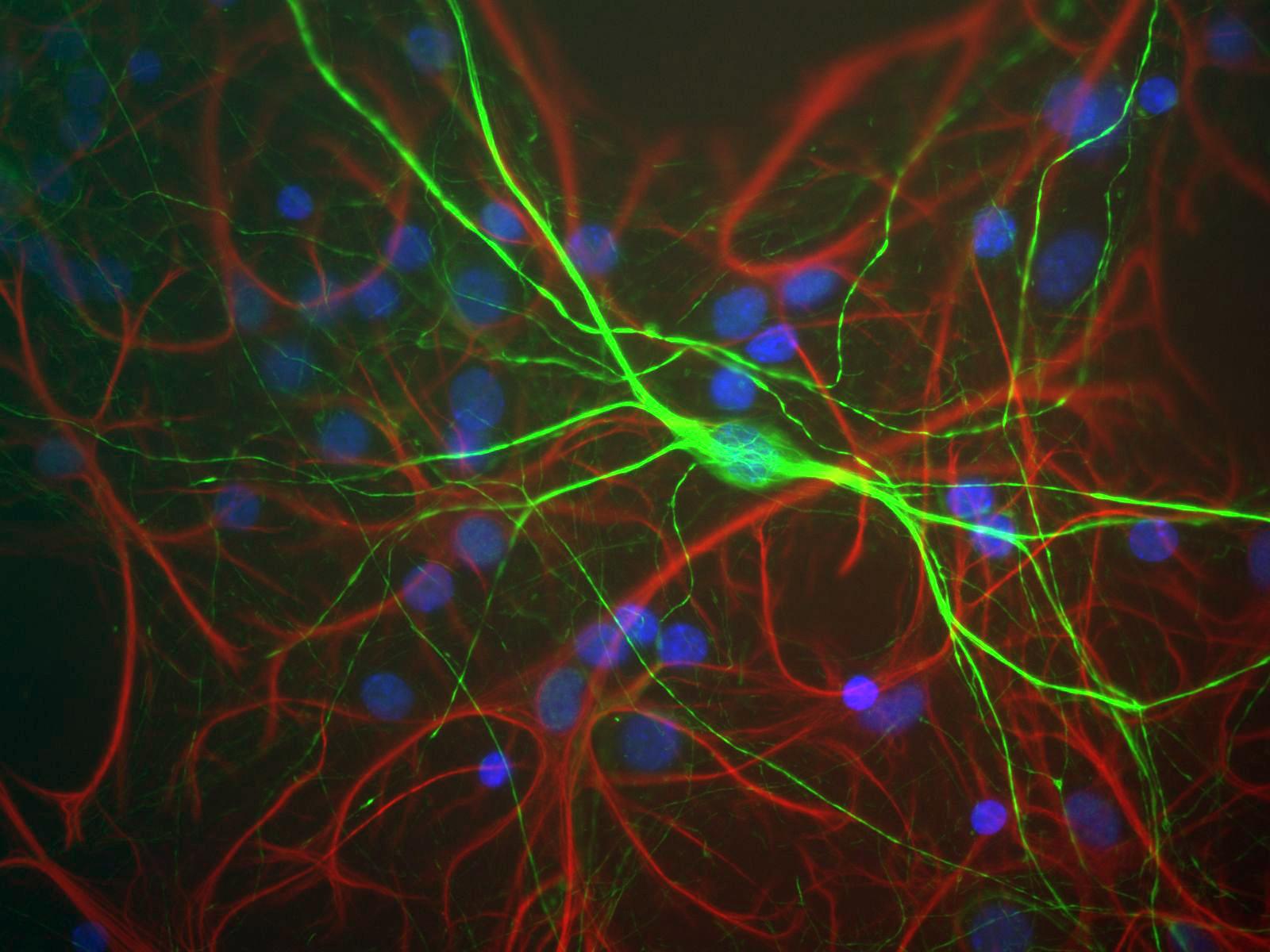 Figure 1: Mixed neuron/glial rat brain cultures stained with 34-1078 -pind (green) and chicken polyclonal antibody to Glial Fibrillary Acidic Protein (GFAP) 34-1046 (red). The neurofilament NF-H antibody binds to phosphorylated axonal forms of NF-H and non-phosphorylated dendritic and perikaryal forms.