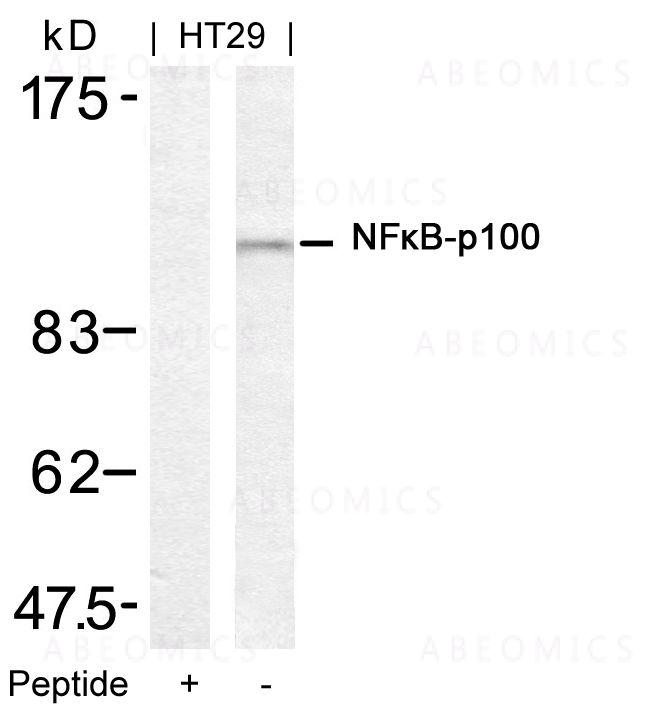 Figure 1: Western blot analysis of extracts from HT29 cells using NFkB-p100(Ab-872) Antibody 35-1625 and the same antibody preincubated with blocking peptide.