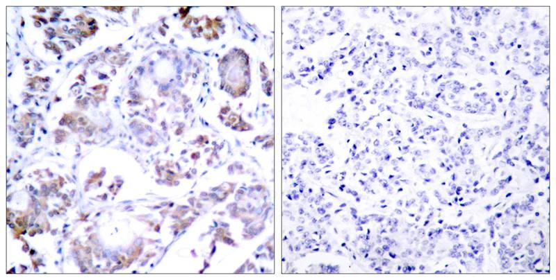 Figure 1: Immunohistochemical analysis of paraffin-embedded human breast carcinoma tissue using NFkB-p65(Ab-254) Antibody 35-1367 (left) or the same antibody preincubated with blocking peptide(right).