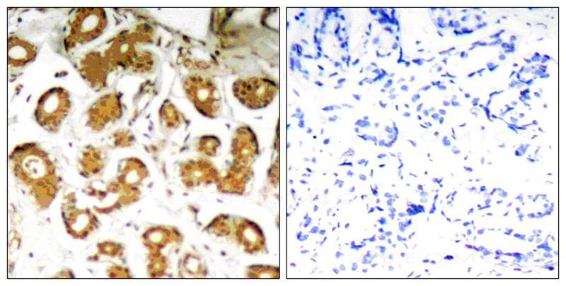 Figure 1: Immunohistochemical analysis of paraffin-embedded human breast carcinoma tissue using NFkB-p65(Ab-505) Antibody 35-1520 (left) or the same antibody preincubated with blocking peptide(right).