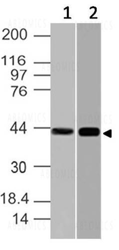 Fig-1: Western blot analysis of NFKBIL1. Anti-NFKBIL1 antibody (11-6005) was used at 4 µg/ml on (1) A431 and (2) A375 lysates.