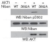 Figure 1: Western blot analysis in vitro kinase assays were performed by mixing purified bacterially expressed WT His–Niban or the His–Niban S602A with or without purified active AKT1 using Niban (Phospho-Ser602) Antibody 35-1343 .