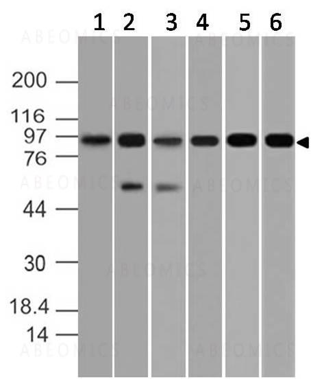Figure-1: Western blot analysis of NIK. Anti-NIK antibody (11-6012) was used at 2 µg/ml on (1) Hela, (2) HepG2, (3) MOLT-4, (4) PC3, (5) RAW and (6) EL-4 lysates.