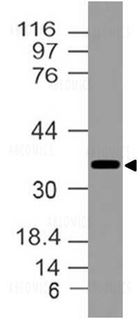 Fig-1: Expression analysis of NKX2-5. Anti-NKX2-5 antibody (11-12023) was used at 2 µg/ml on MCF-7 lysate.