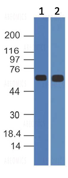 Fig-1: Western blot analysis of NRF2. Anti-NRF2 antibody (11-12046) was used at 2 µg/ml on (1) h Kidney and (2) h Liver lysates.