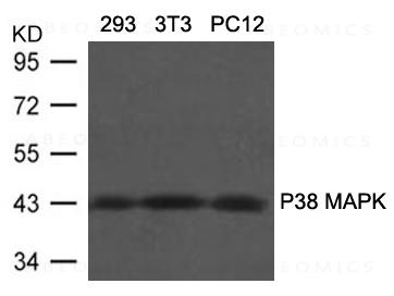 Figure 1: Western blot analysis of extracts from 293, 3T3 and PC12 cells using P38 MAPK(Ab-180/182) Antibody 35-1851 .