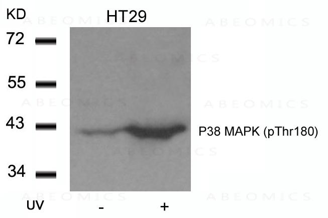 Figure 1: Western blot analysis of extracts from HT29 cells untreated or treated with UV using P38 MAPK(Phospho-Thr180) Antibody 35-1233 .