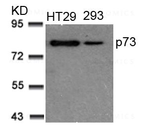 Figure 1: Western blot analysis of extracts from HT29 and 293 cells using p73(Ab-99) Antibody 35-1429 .