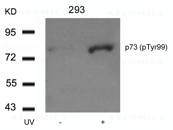 Figure 1: Western blot analysis of extracts from 293 cells untreated or treated with UV using p73(Phospho-Tyr99) Antibody 35-1057 .