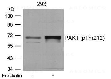Figure 1: Western blot analysis of extracts from 293 cells untreated or treated with forskolin using PAK1(Phospho-Thr212) Antibody 35-1148 .