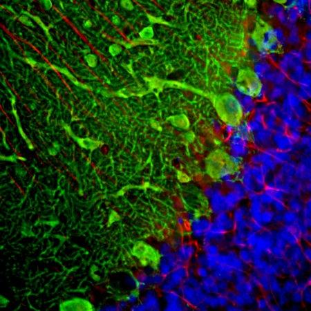 Figure-1: Immunofluorescent analysis of a rat cerebellum section stained with chicken pAb to parvalbumin,(34-1099), dilution 1:2,000, in green, and costained with mouse mAb to GFAP, dilution 1:500, in red. The blue is DAPI staining of nuclear DNA. Following transcardial perfusion of rat with 4% paraformaldehyde, brain was post fixed for 24 hours, cut to 45μM, and free floating sections were stained with above antibodies. The(34-1099) antibody labels the perikarya and dendrites of Purkinje cells and interneurons in the molecular layer of the cerebellum. The GFAP antibody stains the processes of Bergmann glia and astrocytes.