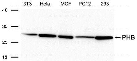 Figure 1: Western blot analysis of extracts from 3T3,Hela,MCF,PC12 and 293 cells using PHB Antibody 35-1861 .