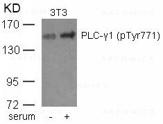 Figure 1: Western blot analysis of extracts from 3T3 cells untreated or treated with serum using PLC-g1(phospho-Tyr771) Antibody 35-1314 .