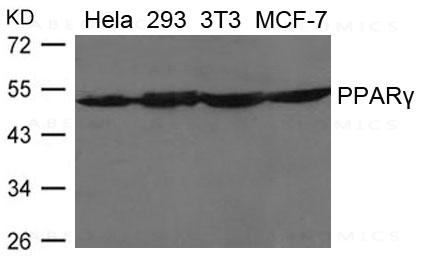 Figure 1: Western blot analysis of extracts from Hela, 293, 3T3 and MCF-7 cells using PPARg Antibody 35-1817 .