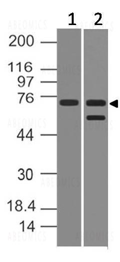 Figure-1: Western blot analysis of PRDM5. Anti- PRDM5 antibody (11-7032) was used at 2 µg/ml on (1) HepG2 and (2) PC3 lysates.