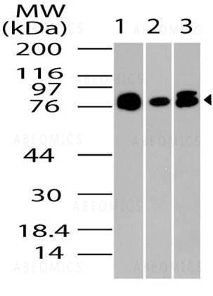 Fig-1: Western blot analysis of PRMT7. Anti- PRMT7 antibody (11-7018) was used at 4 µg/ml on 1) Jurkat, 2) 293 and 3) Raw lysates.