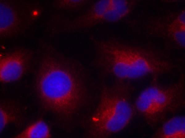 Figure 1: Immunofluorescence staining of methanol-fixed HeLa cells using PTEN (phospho-Ser380) antibody (35-1008 , Red).