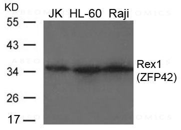 Figure 1: Western blot analysis of extracts from JK, HL-60 and Raji cells using Rex1(ZFP42) Antibody 35-1829 .