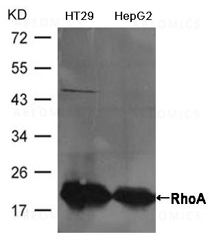 Figure 1: Western blot analysis of extracts from HT29 and HepG2 cells using RhoA Antibody 35-1769 .