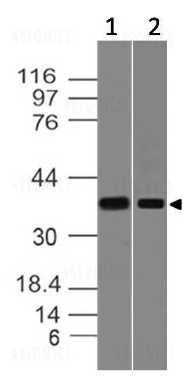 Fig-1: Western blot analysis of S1P2/Edg5. Anti- S1P2/Edg5 antibody (11-8042) was used at 1 µg/ml on (1) Hela and (2) h Intestine lysates.