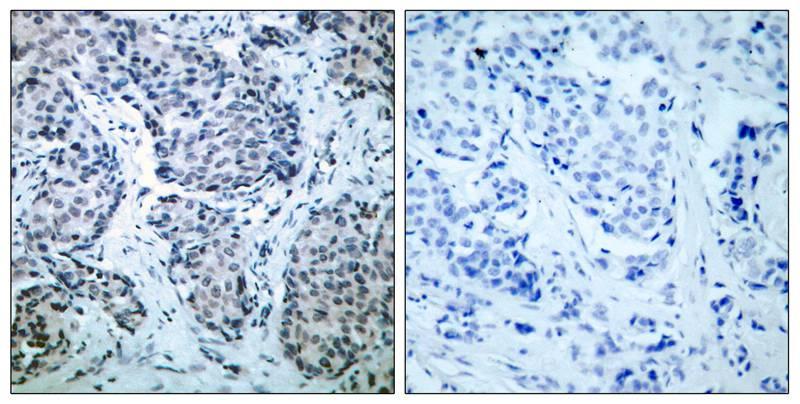 Figure 1: Immunohistochemical analysis of paraffin-embedded human breast carcinoma tissue using SEK1/MKK4(Phospho-Thr261) Antibody 35-1167 (left) or the same antibody preincubated with blocking peptide(right).