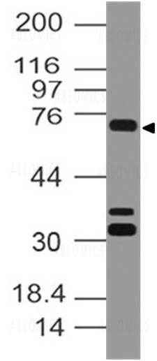 Figure-1: Western blot analysis of Human SENP1. Anti- Human SENP1 antibody (11-8103) was used at 2 µg/ml on h Testis lysate.