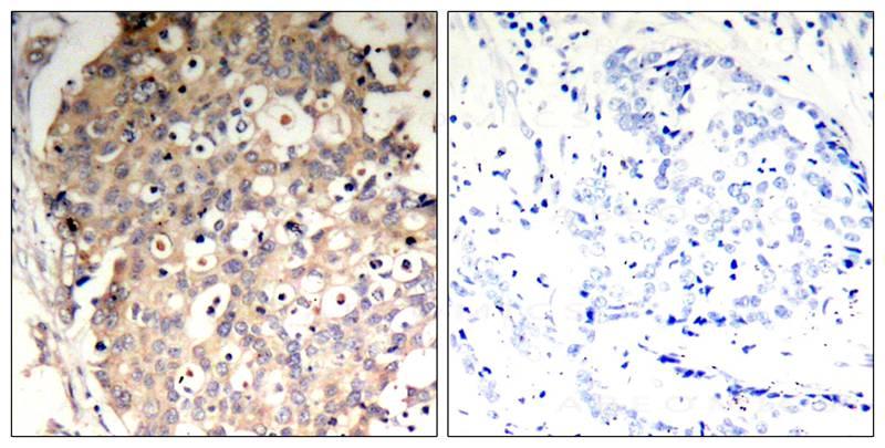 Figure 1: Immunohistochemical analysis of paraffin-embedded human breast carcinoma tissue using SHP-1(Phospho-Tyr536) Antibody 35-1286 (left) or the same antibody preincubated with blocking peptide(right).
