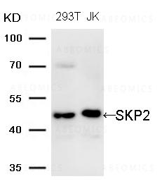 Figure 1: Western blot analysis of extracts from 293T and JK cells using SKP2 (Ab-64) Antibody 35-1868 .
