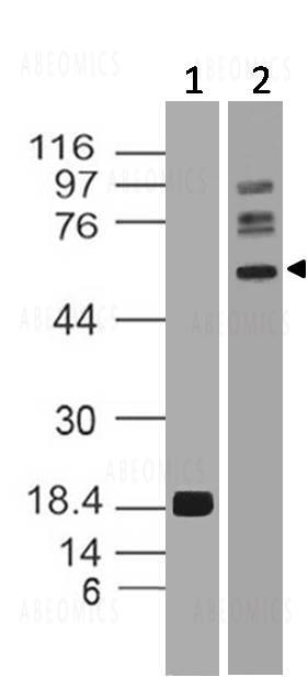 Figure-1: Western blot analysis of SMAD4. Anti- SMAD4 antibody (11-7581) was used at 0.1 µg/ml on (1) Recombinant and 2 ug/ml on (2) Hela lysates.