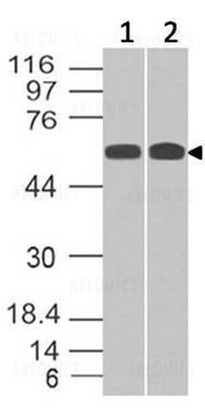 Figure-1: Western blot analysis of SMAD4. Anti-SMAD4 antibody (11-7589) was used at 2 µg/ml on (1) U87 and (2) Miapica-2 lysates.