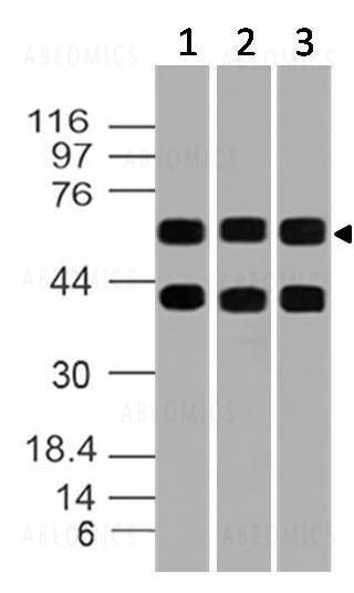 Fig-1: Western blot analysis of SODD/BAG4. Anti- SODD/BAG4 antibody (20-1116) was used with 1:1000 dilution on (1) THP1, (2) Jurkat and (3) HepG2 lysates.