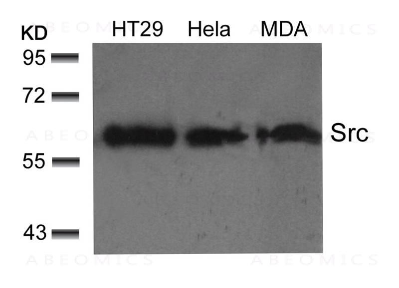 Figure 1: Western blot analysis of extracts from HT29, Hela and MDA cells using Src(Ab-529) Antibody 35-1510 .